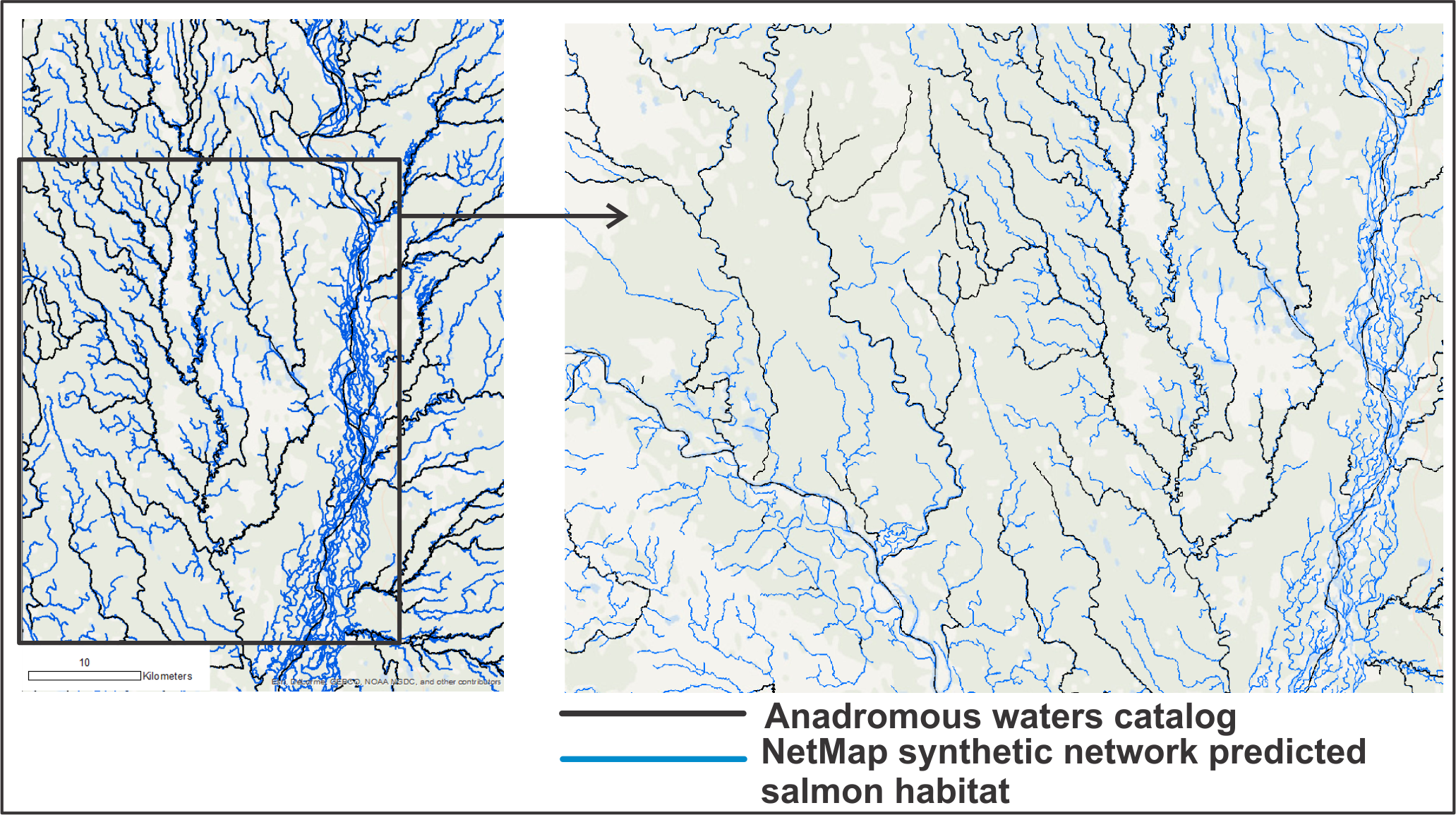 NetMap was used to build a synthetic river network in the Mat-Su watershed (16 million acres) using LiDAR and IfSAR (1-5 m) DEMs to identify missing salmon streams in the Matanuska-Susitna River basin in Alaska. 25,000 additional miles of total streams were mapped. Mapped salmon streams increased by 300% to 1,000%.